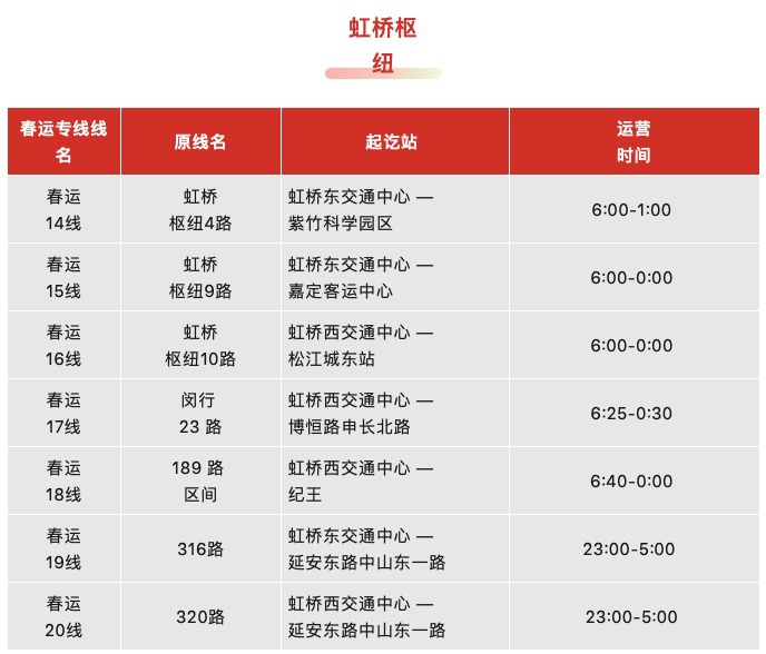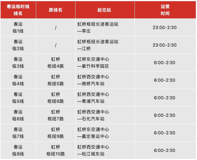 此外,2月14日至2月23日(初五至十四)期间,地面公交在虹桥枢纽增设8条春运临时专线。