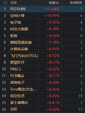 财联社4月17日电,市场全天高开高走,三大指数均涨超2%。大小指数走势分化,微盘股指数涨超8%,全市场逾千股涨超9%。盘面上,低空经济概念股持续活跃,苏交科、海特高新、中信海直、万安科技等10余涨停。存储芯片概念股开盘大涨,佰维存储、德明利、万润科技等涨停。工程机械板块再度走强,柳工、山河智能等涨停。AI概念股集体反弹,其中Sora概念方向领涨,安诺其、元隆雅图涨停;算力、CPO方向震荡走高,股票在线配资高新发展、通宇通讯等涨停。氢能源概念股盘中异动,新动力、京城股份、四川金顶等近20股涨停。总体上个股涨多跌少,全市场超5100只个股上涨。沪深两市今日成交额9185亿,较上个交易日缩量287亿。板块方面,飞行汽车、Sora概念、铜缆高速连接、存储芯片等板块涨幅居前,ST等少数板块下跌。截至收盘,沪指涨2.14%,深成指涨2.48%,创业板指涨2.11%。北向资金全天净卖出2.32亿,其中沪股通净卖出2.55亿元,深股通净买入0.23亿元。