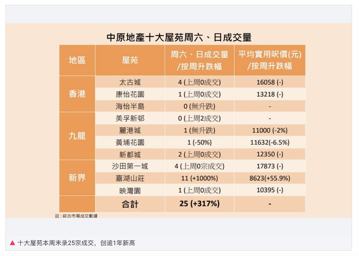 同时看房量也已实现成交转化。根据中原地产的监测数据,中原地产十大屋苑周末录得25宗成交,按周反弹3.2倍,成交量创逾1年新高,其中,新界区成交占比达64%。
